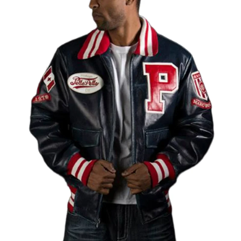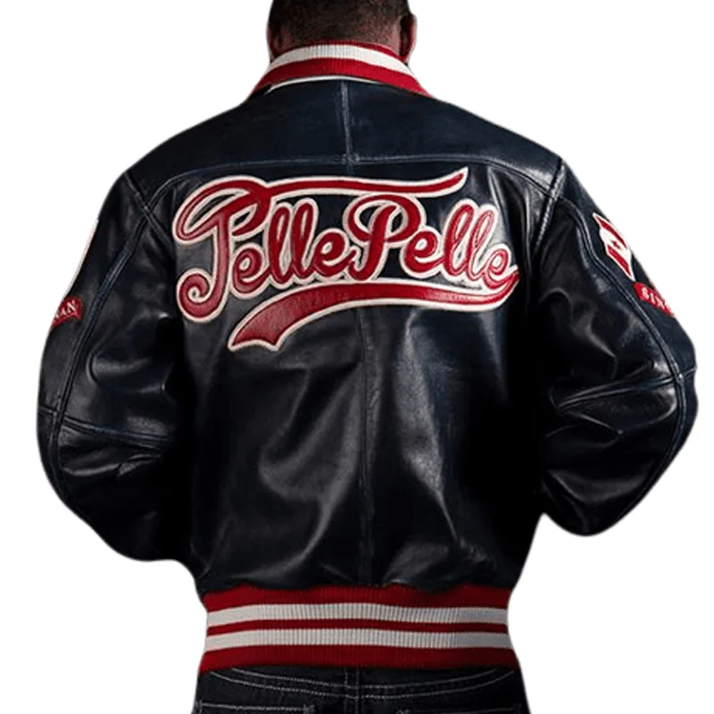 Pelle Pelle Mens Navy Blue Plush Varsity Bomber Leather Jacket
